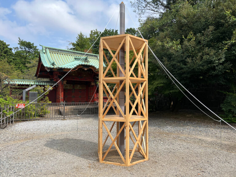 このエリアのメイン会場のひとつが、2025年に創建400年を迎える東叡山 寛永寺です。まず西村雄輔は常憲院霊廟勅額門前に『ECHO works - 回向柱』を展示。回向柱とは長野・善光寺の前立本尊御開帳の際に本堂の正面に立てられる角塔婆で、これに触れると前立本尊とつながり、ご利益があるといわれています。