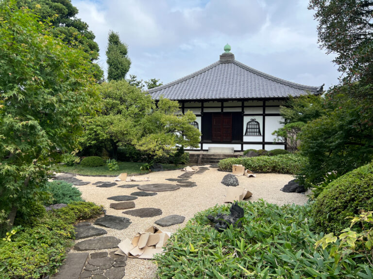 通常、非公開の渋沢家霊堂前庭における日比野克彦の『ALL TOGETHER NOW』も見逃せません。日比野は「東京ビエンナーレ2023 はじまり展」にて、徳川家の菩提寺である寛永寺の庭に15人の将軍が一人ずつ段ボール箱として庭に宅配されて集まり、のちにその箱自体が人格を持ちながら庭に佇んで、過去の時間と現在をつなぐリンケージ観を表現しました。