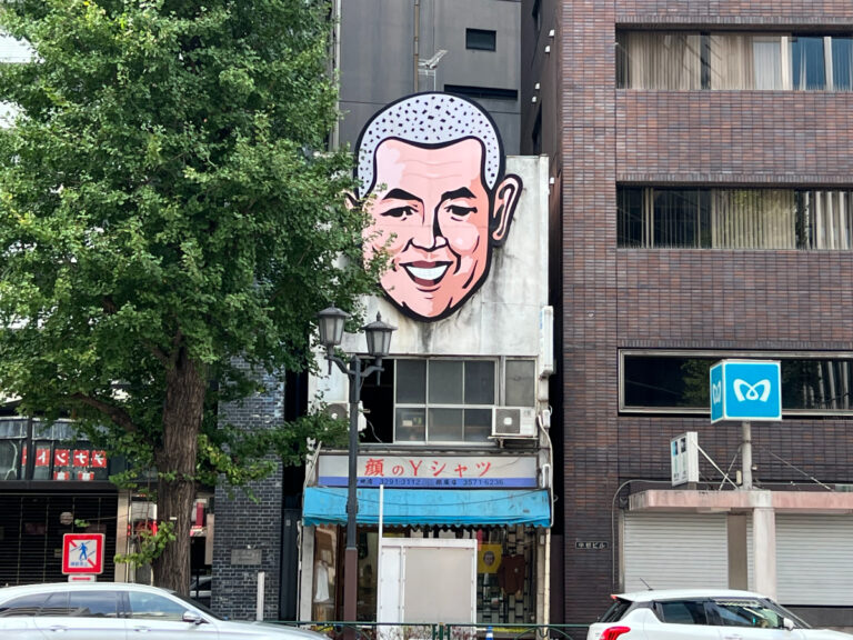 小川町交差点近くにある「顔のYシャツ」とは、1920年の創業で、大きな顔の看板がトレードマークのオーダーワイシャツ専門店です。関東大震災で罹災するもの店舗を再興し、長く同じ場所にて営業していましたが、2020年に惜しまれつつ閉店しました。特徴的な看板は、初代店主の梶永松氏の青年時代の似顔絵を意匠に用いています。