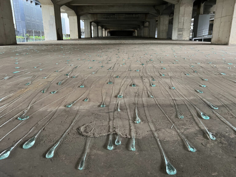 中村はサーキュラーエコノミー(原料→生産→消費→リサイクルのプロセス)に新たなアクションを起こすべく、解体現場で打ち捨てられたガラスを新たに加工。新たな息吹を得た約2000個ものガラスによるインスタレーションを展開しています。