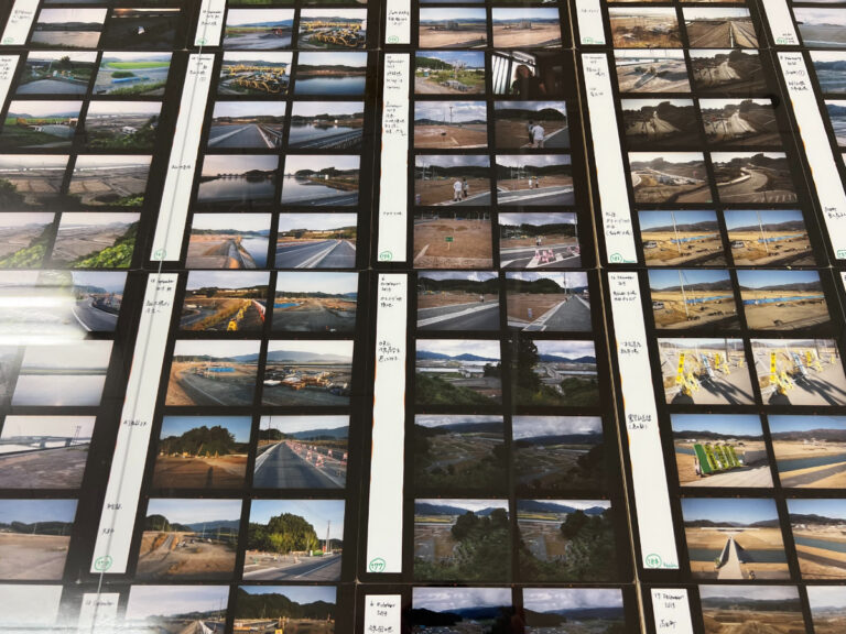 そのうち畠山直哉は、東日本大震災における津波で実家が失われたことを境に撮りはじめた、故郷の陸前高田の写真のコンタクトプリントを展示。コンタクトプリントには畠山がシャッターを切ったカットがそのままの順番で写っていて、津波で大きく被害を受け、やがて復興していく陸前高田の光景を畠山がどのように撮影していったのかをたどることができます。