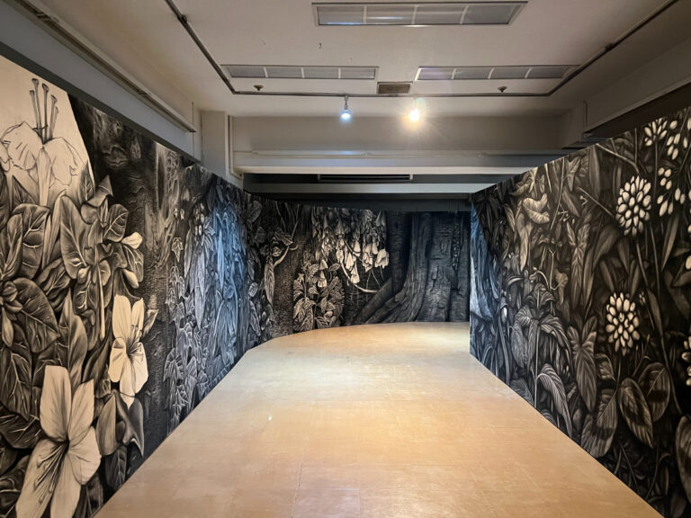 佐藤直樹による植物の大型木炭画シリーズの展示も圧巻といえるでしょう。佐藤は2014年よりさまざまな場所を彷徨いながら、各地で出会った自然のモチーフを木炭にて描き続けていて、10年目を目前とした今年、ついに300メートル近くの幅に達するに至りました。