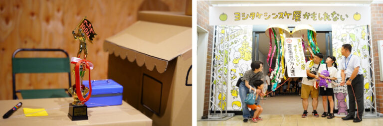 さらに来場者への感謝を込めて、ヨシタケさんが新たに描き下ろした100万人感謝メッセージとトロフィーが秋田会場で特別展示されています。段ボールに描かれた温かみのある手描きのイラストは、作家の人柄がにじみ出る心温まる作品となっており、今後の巡回会場でも展示される予定です。