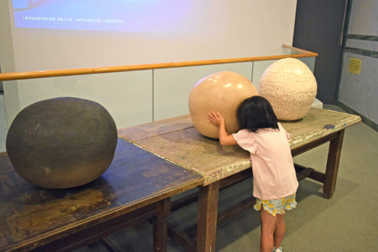 展示の中には、触れるコーナーもあります。8階の企画展示室のロビーには、感触や音を楽しむ作品が設置されています。ひとつずつ観察すると、「ツルツル」「ゴツゴツ」など手触りに違いがあったり、音の響き方が異なっていたりと、発見がありました。