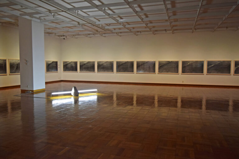 7階 企画展示室の展示風景。河口龍夫氏の《陸と海》(1970年、写真作品)と《石と光》(1971/1989年、立体作品)