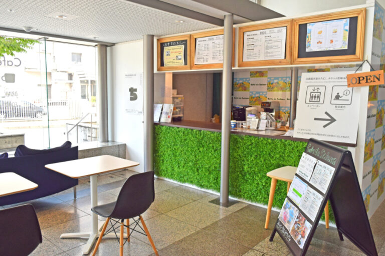 美術館通りのエントランスを入ってすぐの場所にある、「Café de Seizan」。パスタやピラフなどのランチメニューをはじめ、軽食のトーストやプリンなどのデザートも提供しています。リーズナブルに多彩なメニューを味わえるのが魅力。