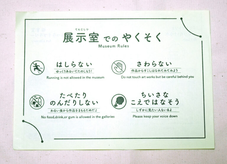 まず、8階の受付で、チケットを購入しましょう。お子さん向けの「展示室でのやくそく」シートを受け取ったら、次の4つのお約束を親子で確認しておくと安心です。