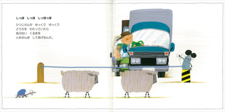 『しっぽ しっぽ しっぽっぽ』は、キャラクターの多彩な表情も見どころのひとつ。羊が道路を渡るために車をとおせんぼするページでは、きびきびとした顔つきのねずみと、困り顔の人間たちが、対比されるように描かれています。