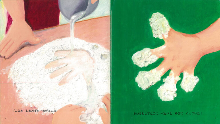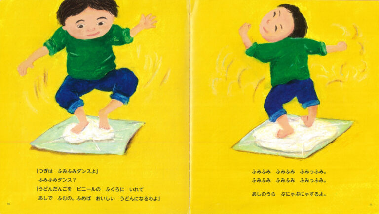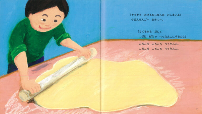 うどんの粉と塩水を混ぜるシーンでは、さらさらとした粉が塊になっていく感触が、生き生きと表現されています。「ふわふわしてたのに ぺとぺと ゆびに くっついた!」というセリフから、手ざわりの変化まで感じられるでしょう。