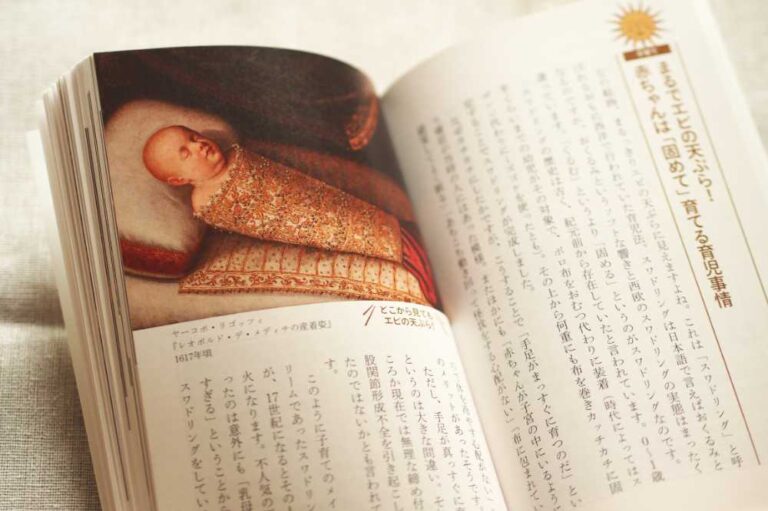 たとえば、エビ天のような形で姿勢を固定された赤ちゃんの絵画。これは「スワドリング」と言って、直訳すると「おくるみ」となります。が、そんな優しいものではなく、ガチガチに固めて身動きを取れないようにしてしまうものでした。
