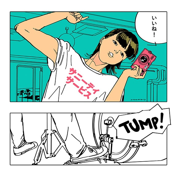 葛飾北斎や河鍋暁斎の展示や、大友克洋や江口寿史など1980年代のマンガ家からインスピレーションを受けて、独自の画風を築き上げていきます。2020年には、サニーデイ・サービスの「いいね!」のカバージャケットで、コマ割りマンガ風のイラストで特有のファッションセンスを表現しています。