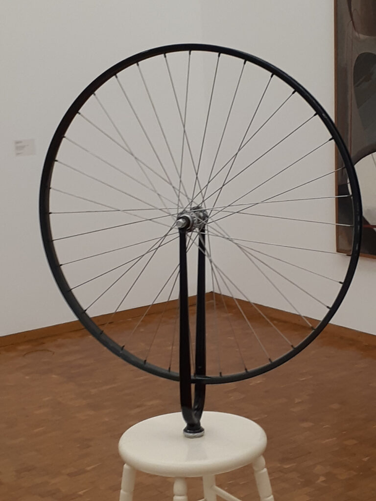 作品自体はシンプルです。ひっくり返された自転車の車輪が木製のスツールにネジ留めされているだけなのですが、見る人がどう解釈するかが最も大切なポイントです。